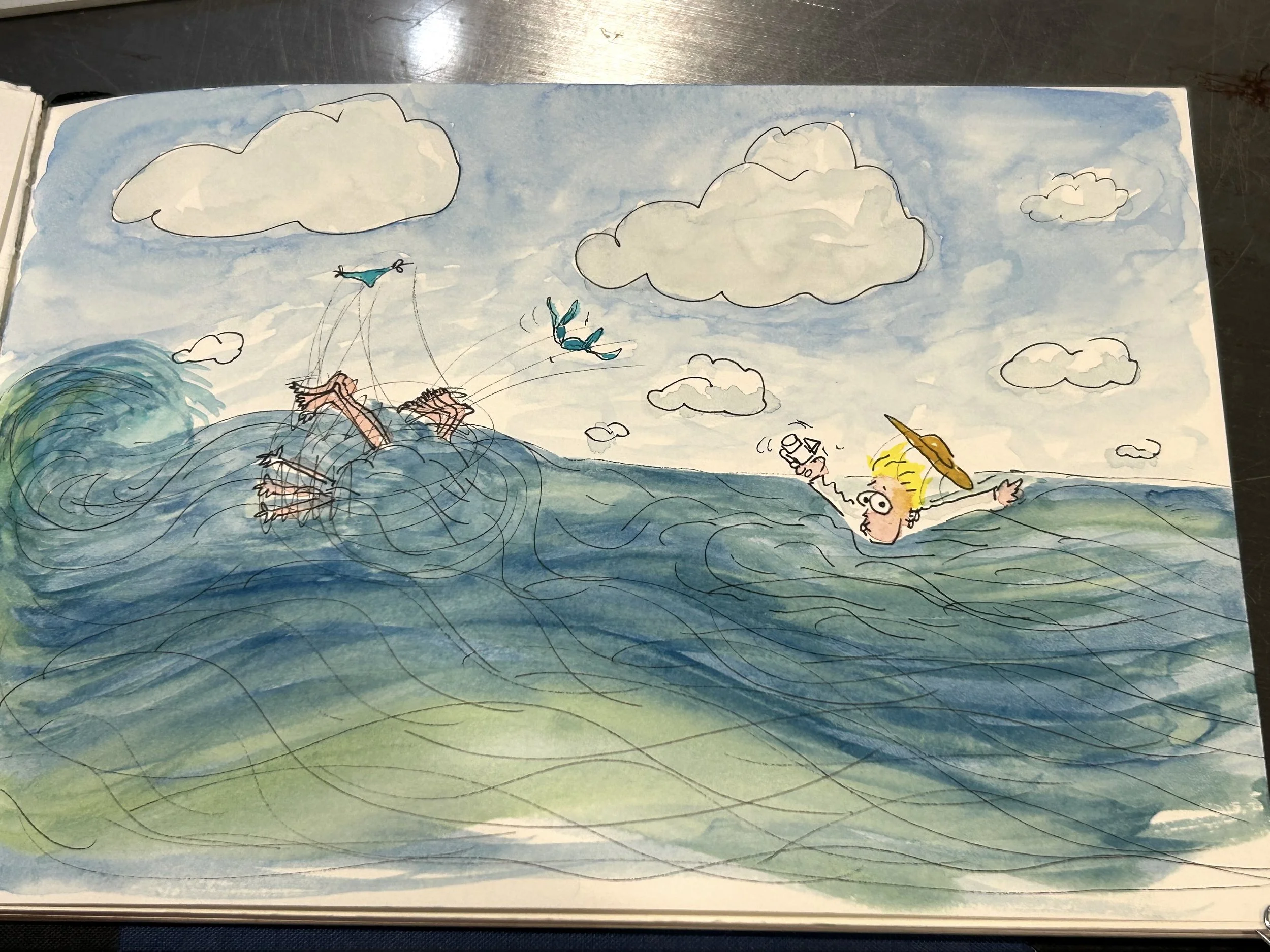 Above is a cartoon of one of the many crazy adventures I had there. We got into a water balloon fight in the Bois de Boulogne. That’s my friend there in the back of the boat on the left throwing a water balloon at me. Or wait. Was it a vodka balloon fight. I can’t remember if it was water or vodka. We had water gun fights with vodka.