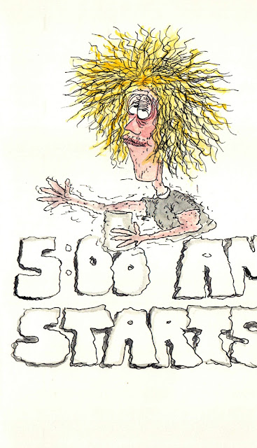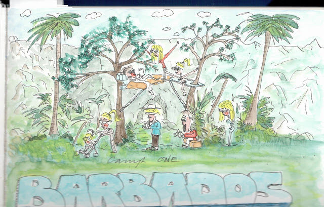 Hi Everybody. Can you believe it's December already. Time goes by when you're having so much fun! I'm kind of being sarcastic, anyway, hey, I was looking on my previous blog, and the last cartoon is a true story. I was in the Keys in Florida. I was shooting a photographic job in my favorite place in Islamorada. Anyway, I got done with my photographic shoot early. I had time to go for a quick windsurf. I was going to meet my friend Hubert in front of his house. Well when I got there to meet him, the manager of the resort told me Hubert was in the hospital. I rushed down there and they told me a damn fish went right through his leg. Talk about surf and turf! Anyway, I obviously didn't go windsurfing that day.
